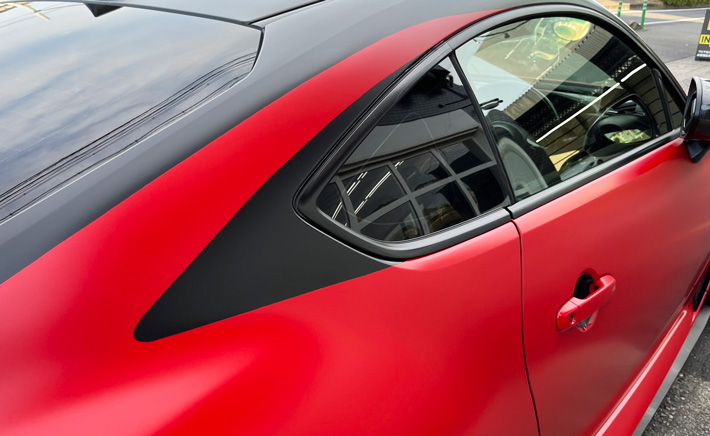 鮮やかなスパークレッドのボディに、マットブラックカラーのラッピングフィルムを貼付け、