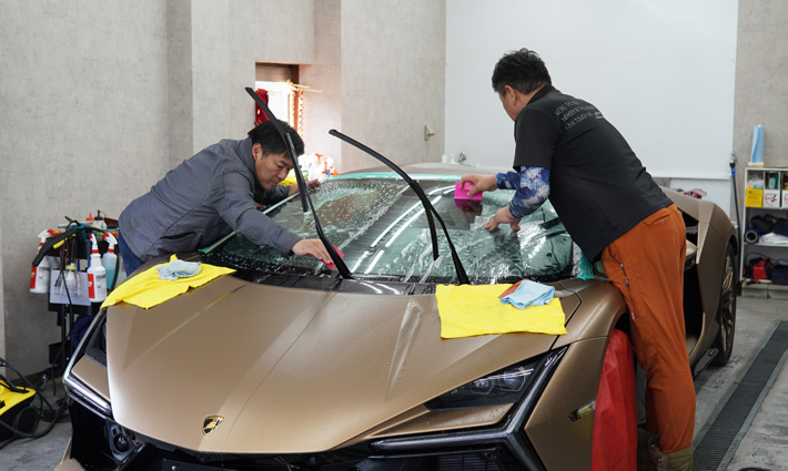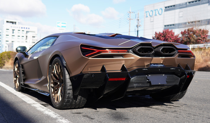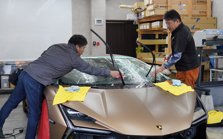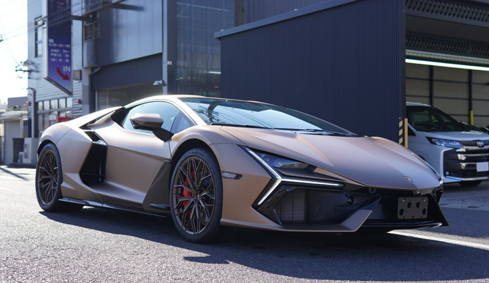 ランボルギーニ「レヴエルト」ゴールド調のマットボディに、艶消しプロテクションフィルムを施工。