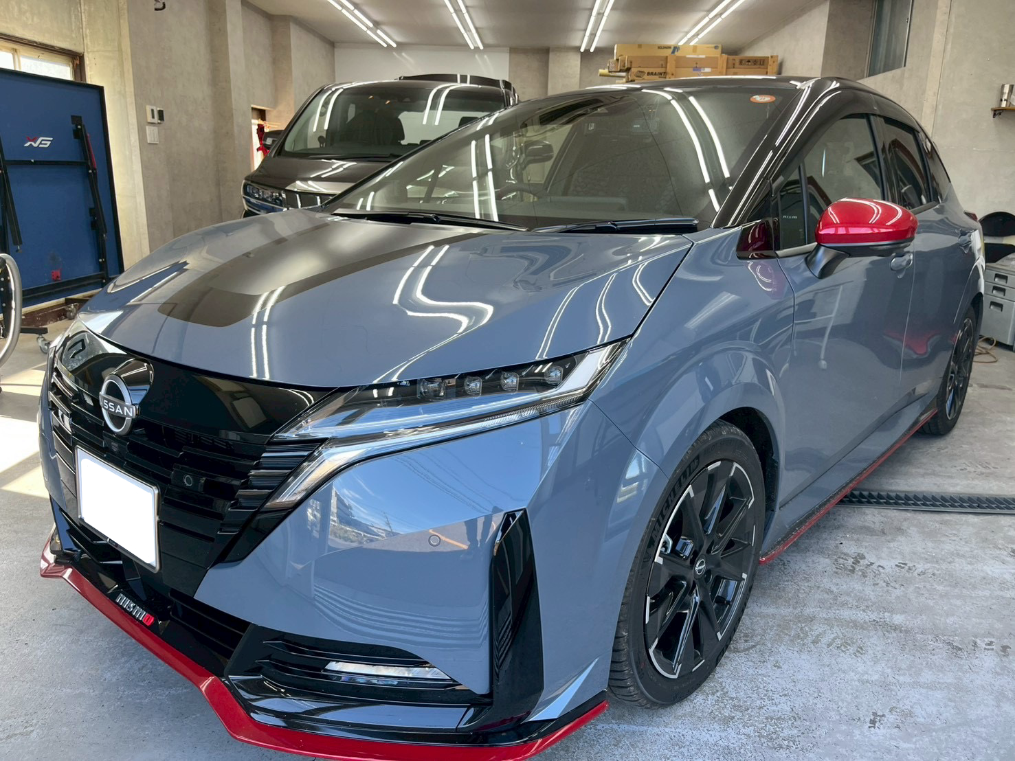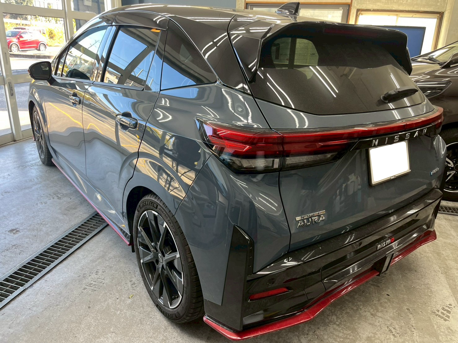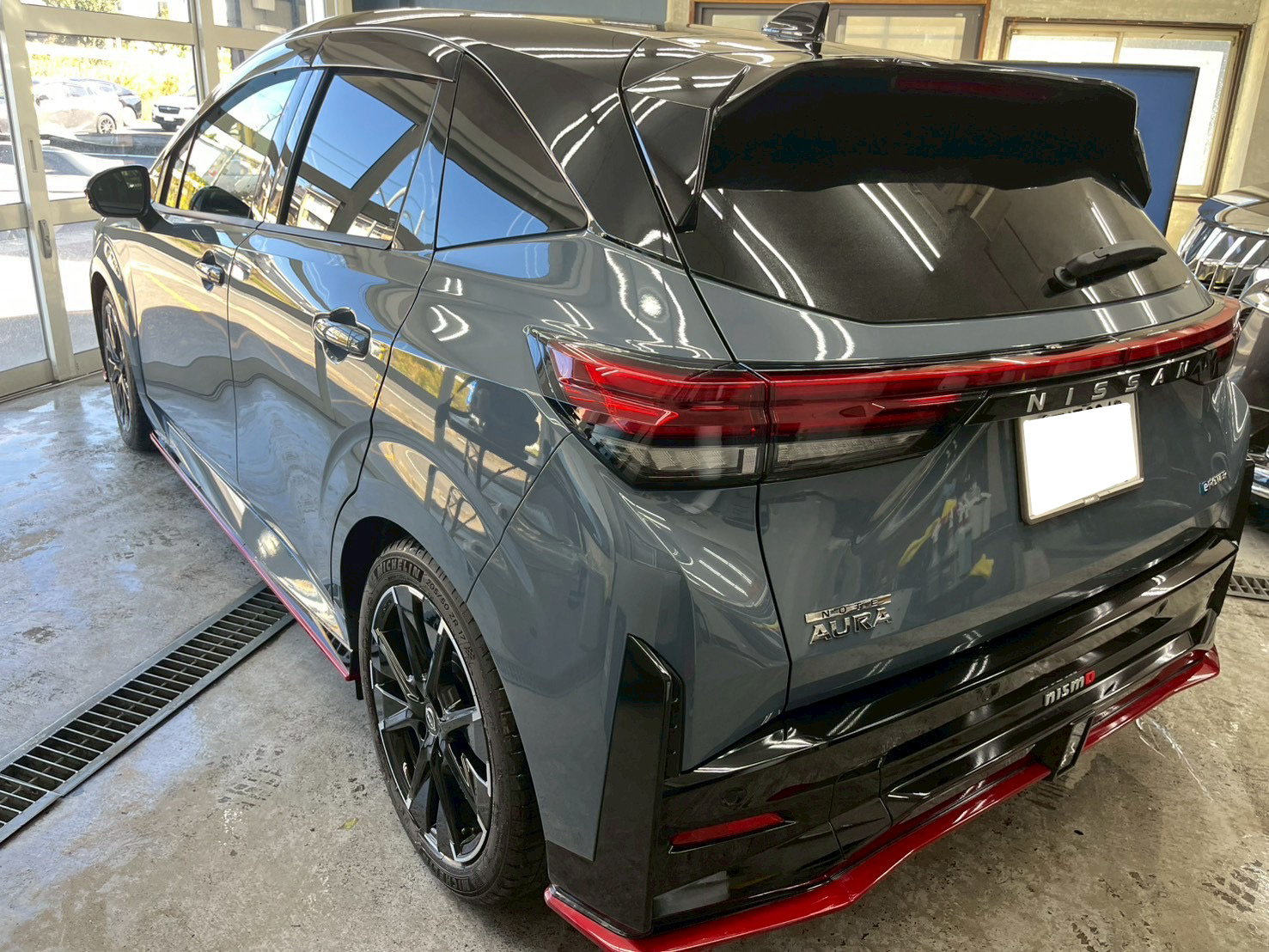カーフィルム、ニッサン オーラ リヤ全面(3%)遮熱スモークフィルム施工