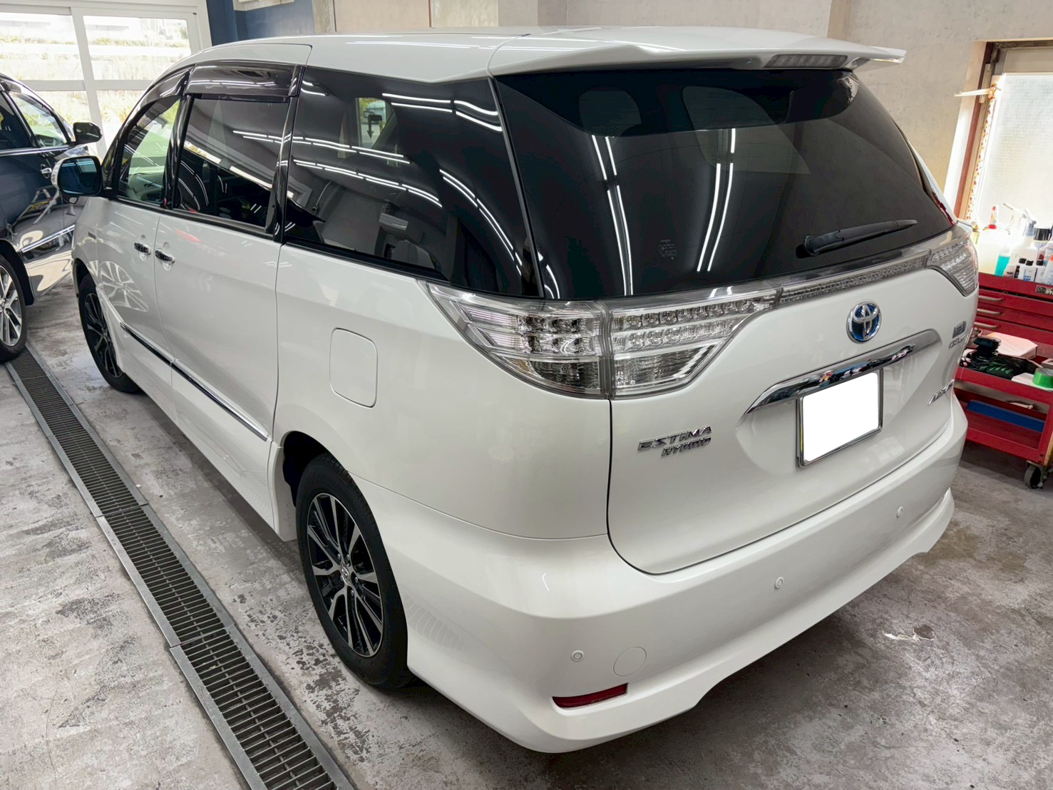 カーフィルム、トヨタ エスティマ リヤ全面(3%)遮熱スモークフィルム施工