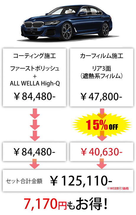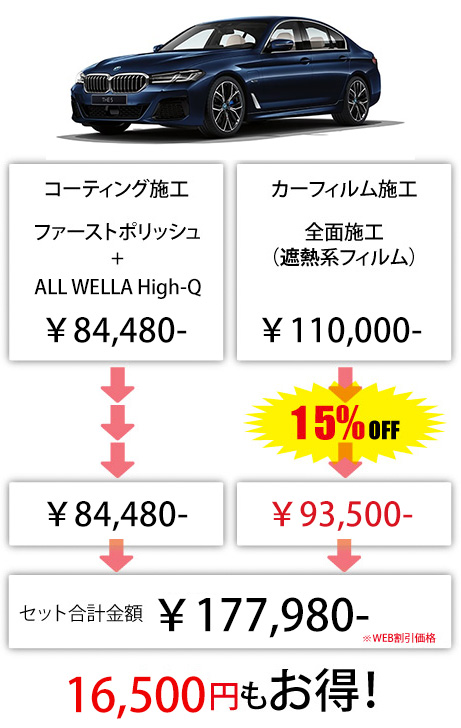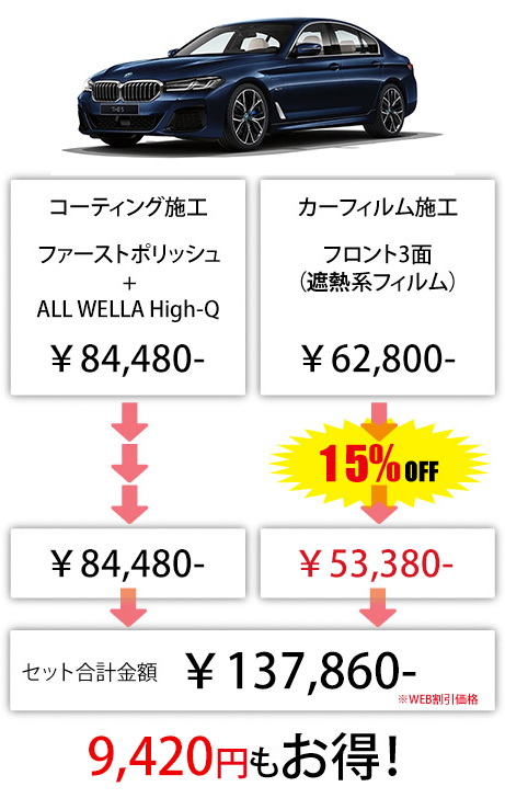 ボディコーティング施工とカーフィルム施工を同時にご注文いただいたお客様には、セット施工割引としてカーフィルム施工価格をさらに15%OFFいたします!