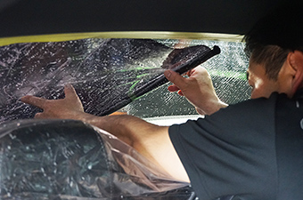 ガラスの形状に合わせてフィルムを成型します。これにより分割貼りの熱線に沿ってカットする必要がなくなり驚くほど美しく仕上げることができます。大きなフィルムを室内で広げることも大変な作業ですが、これもプロならではの技です。
